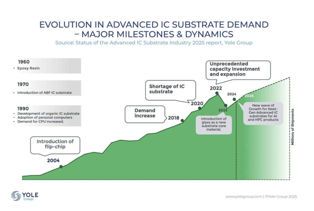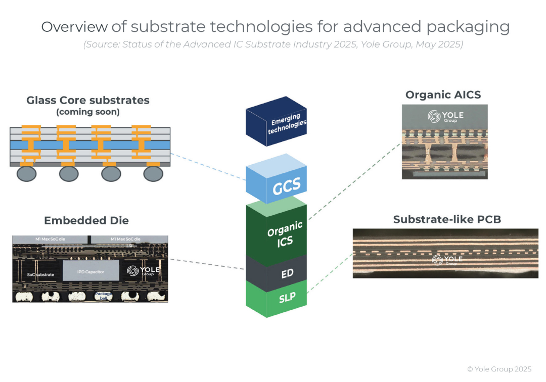 “先进基板技术的格局正在经历多个类别的重大变革。从传统的有机解决方案到新兴的玻璃基架构,2024-2025年标志着基板行业的转型阶段。”Yole强调。